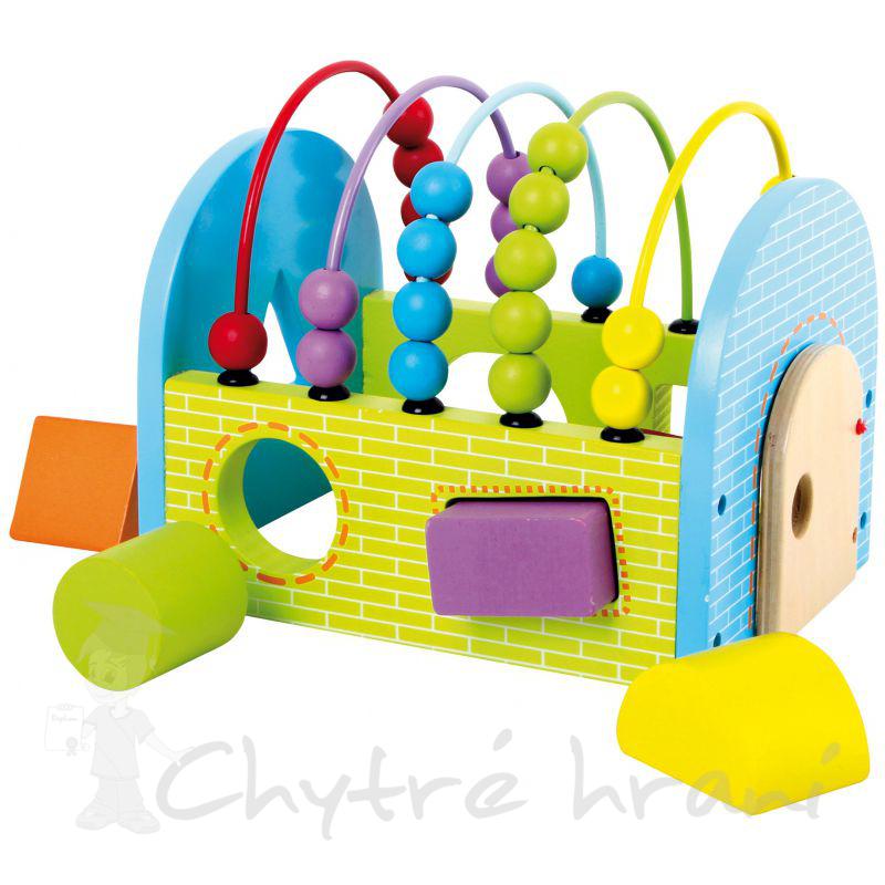 Kvalitní dřevěná hračka od společnosti Legler se stříškou z drátů, na kterých jsou umístěné kuličky, má mnohočetné využití. Děti si hravým způsobem - posouváním kuliček a vkládáním tvarů do správných otvorů procvičí nejen jemnou motoriku, ale učí se i barvy, počítat do pěti a rozlišovat základní geometrické tvary.