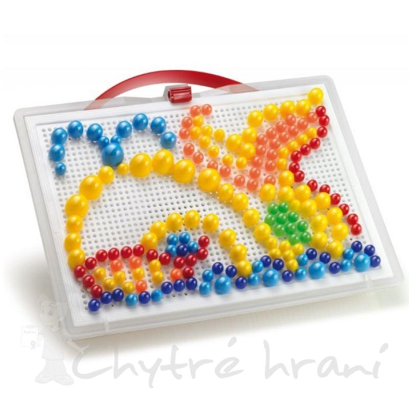 Jednoduchá bezpečná mozaika pro děti od 2 let, velké knoflíky a 16 předloh, které pomohou dětem vytvářet obrázky. A mohou hrát samy.