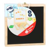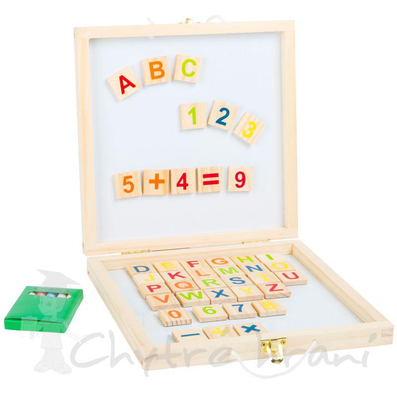 Skvělá hra pro šikovné děti, které jsou zvídavé a rády se učí nové věci. V krásném dřevěném pouzdře děti najdou jak popisovatelnou magnetickou bílou tabuli, tak i klasickou černou, na kterou mohou kreslit přiloženými křídami. Na dřevěných kostičkách s magnetem děti poznávají jednotlivá písmena i číslice a mohou vytvářet jednoduchá slova či matematické příklady. Hračka je také dobrá k procvičení jemné motoriky, která je tolik důležitá pro pozdější rozvoj dítěte.