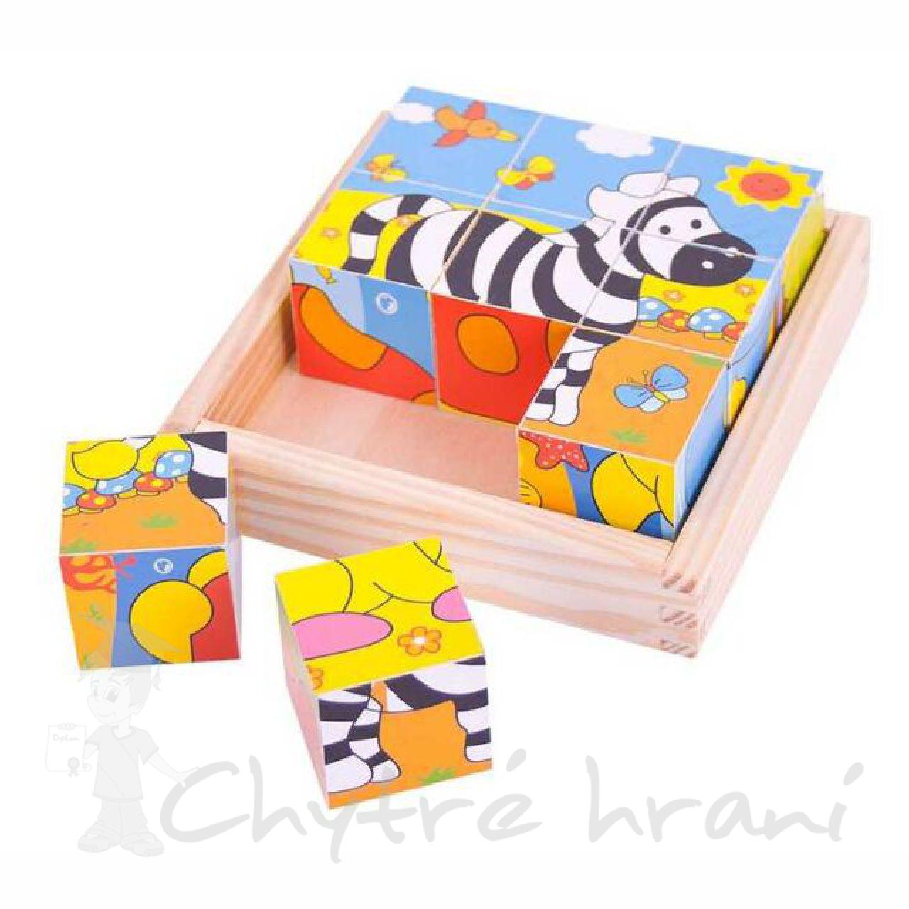 Dětské dřevěné kostky s obrázky zvířátek ze safari. U nejmenších dětí hraní s kostkami rozvíjí jemnou motoriku a koordinaci při bourání a stavění komínů. Starší děti jistě již zvládnout postavit obrázek, při čemž trénují zrakovou syntézu a plošné vnímání. Veselé obrázky.