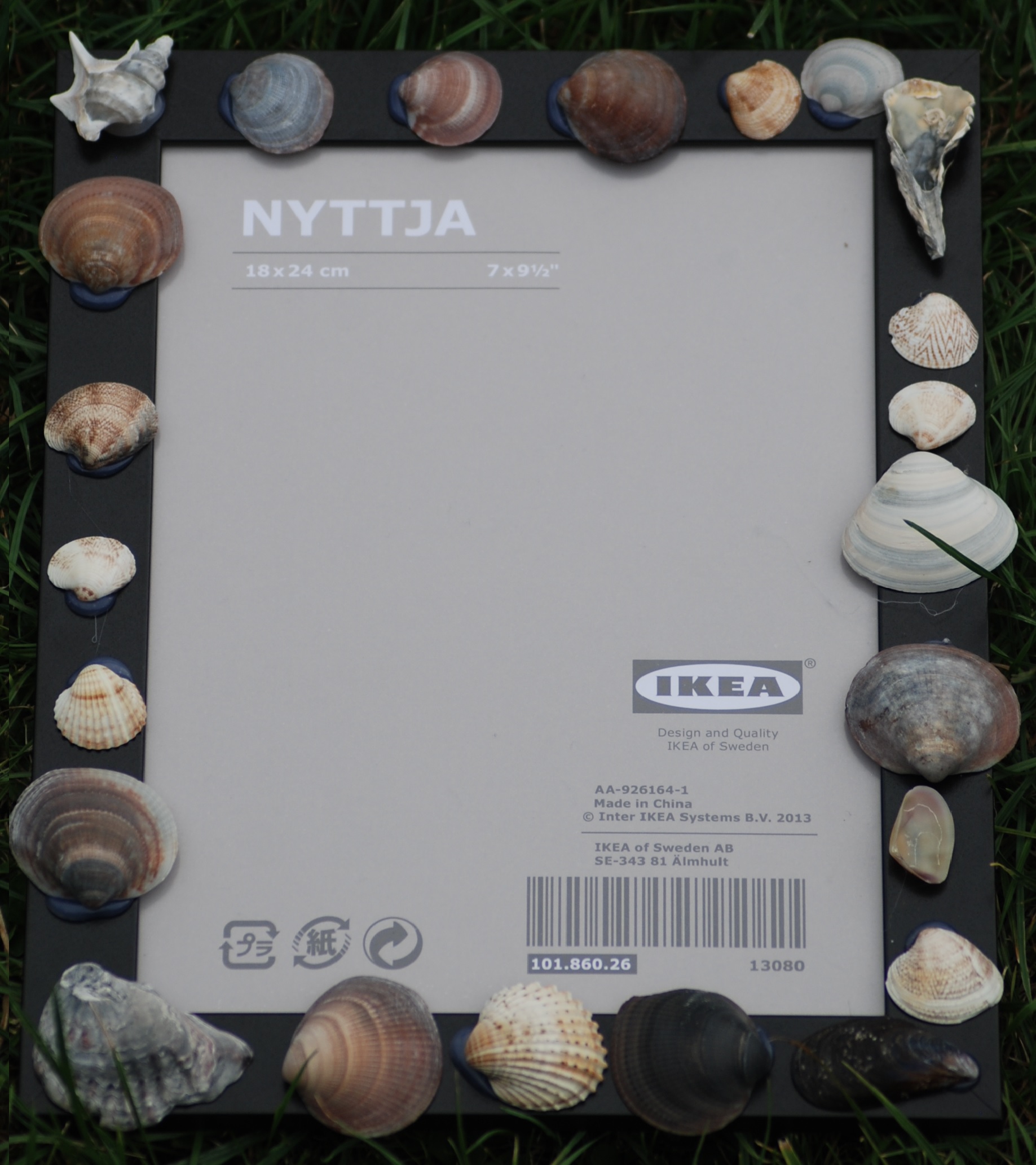 Nevíte, jak zabavit děti, pokud venku jen prší a prší. Zkuste to jako my. Stačí k tomu pár mušliček od moře, obyčejný rámeček na fotky ( my jsme použili ten z Ikey) a tavící pistole.