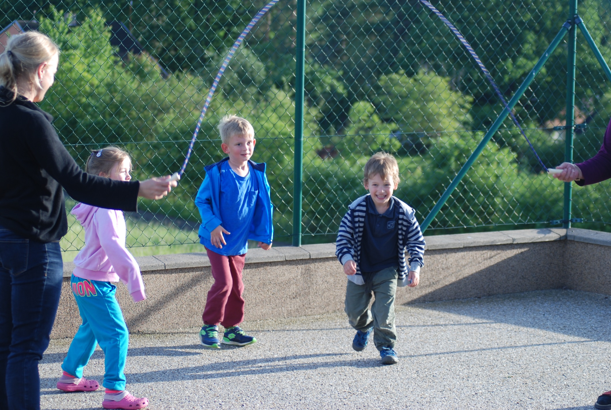 - Čtyřky: Přeskok snožmo dítě stojí ke kroužícímu švihadlu bokem. Opakujeme 4x